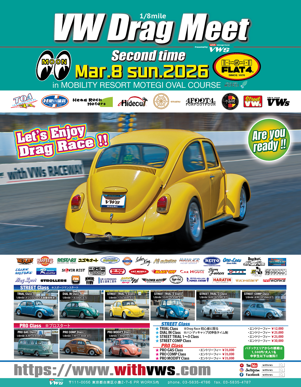 ■ 開催名:VW Drag Meet Second time ■日 時:2026年3月8日(日) ■ 場 所:モビリティーリゾートモテギ ■ ゲートオープン:一般入場は am9:00〜 ■ パドック観戦:1,500円/大人 中学生以下無料 ■ 入場料:レース場入り口にて 1,900円/大人 900円/小学生以下 ■ 駐車場代:普通車1台1,000円 ■料金詳細は、右記をご覧ください。 https://www.mr-motegi.jp/fee_m/ ※ペット同伴は出来ません。